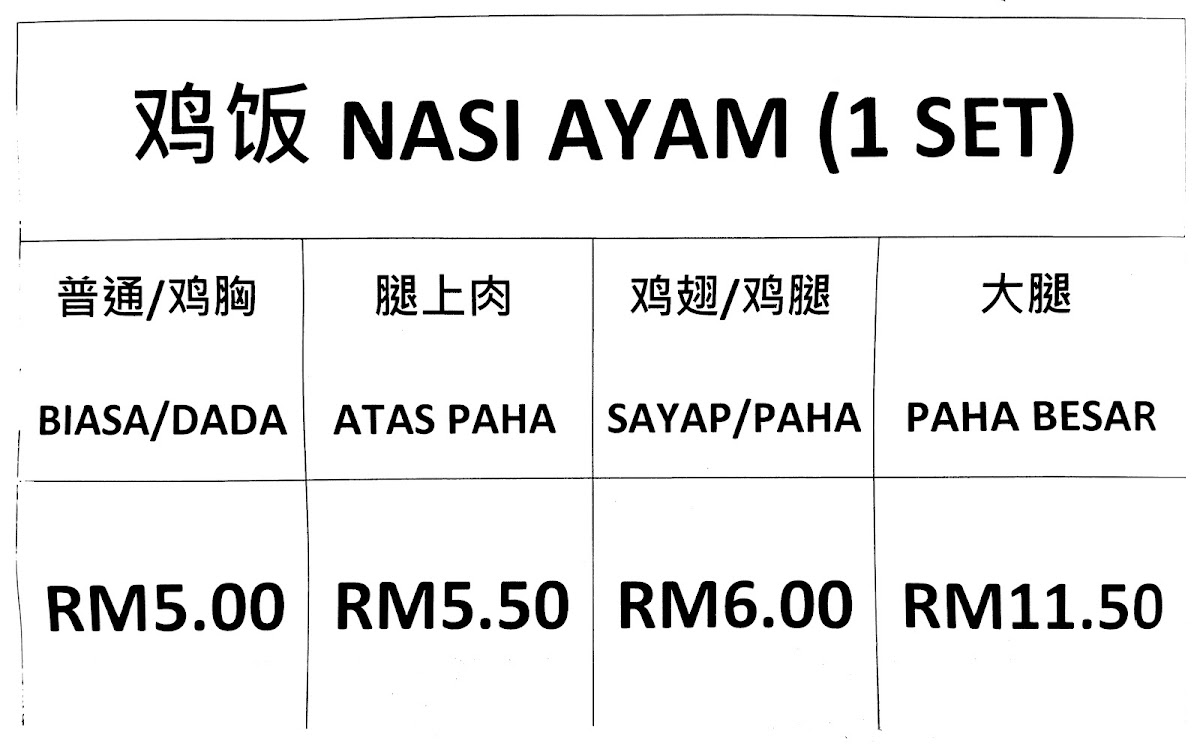 One of the restaurant’s highlights is its Nasi Ayam Set, featuring an assortment of flavorful chicken options. You can enjoy the tender Steamed Chicken Rice (Drumstick) or Steamed Chicken Rice (Thigh), or if you prefer roasted chicken, go for the Roasted Chicken Rice (Breast) or Roasted Chicken Rice (Drumstick). There's also a more basic choice with Roasted Chicken Rice (Standard), offering a satisfying and tasty meal.
